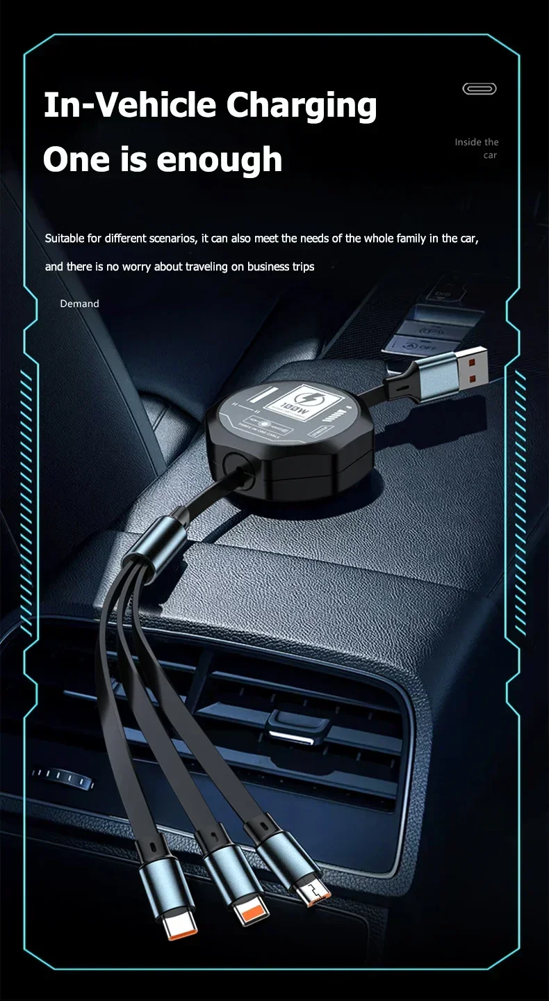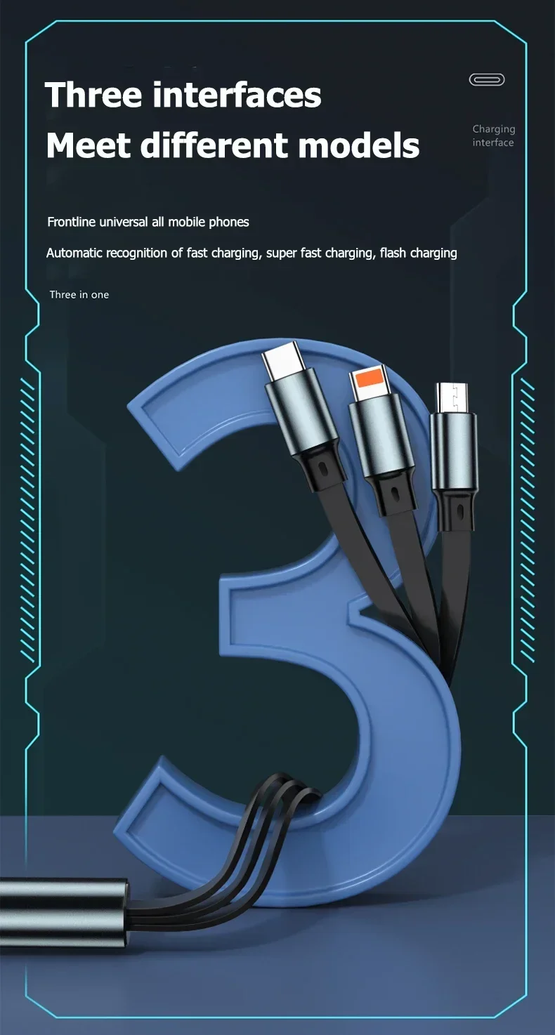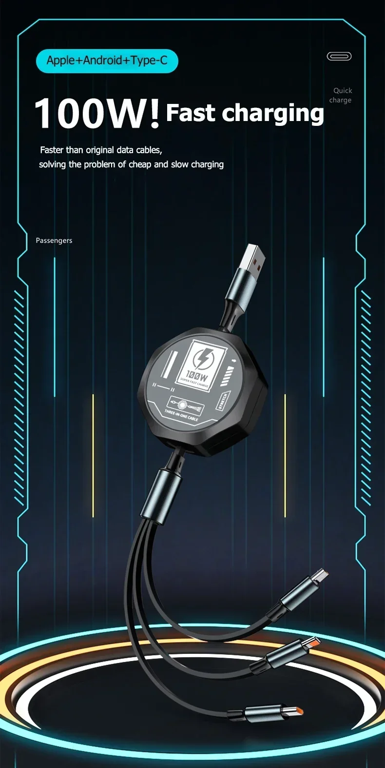 100W 3 In 1 Retractable Usb Cable Fast Charging And Data Micro Usb Type C For Iphone 15 14 13 Pro Max Android Phone Xiaomi Cable